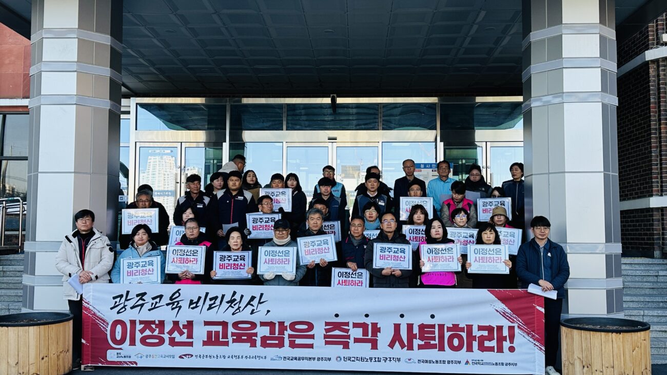 본인의 측근이 지금 채용 비리로 실형을 살게 되었는데, 언제까지 유체이탈 화법으로 남 탓만 할 것인가? 이미 실무자가 구속되어 있는데 윗선이 몰랐다는 것은 손바닥으로 하늘을 가리는 것이다. 이 자리에 모인 광주 교육 관련 노동조합, 단체들은 한 목소리로 이정선 교육감의 뻔뻔함을 강력하게 규탄한다.