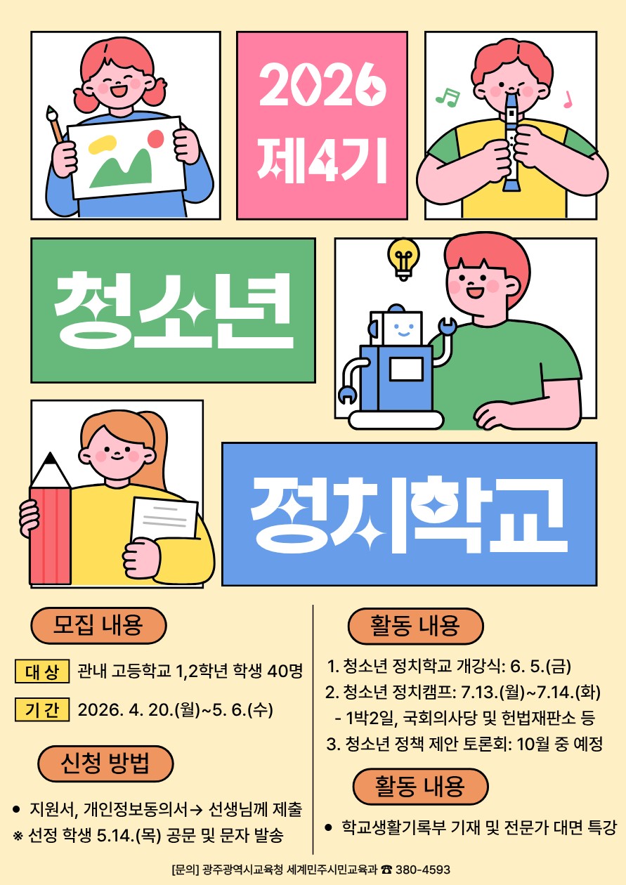 투표 대상은 ▲학부모·시민이 체감하는 변화, 찾아 헤매던 교육 정보·연수를 한 곳에서 바로 찾는 ‘광주 학부모와’ 구축 ▲‘창업? 어렵지 않아요. 빛고을 스타트업 플랫폼에서 시작하자!’ ▲교육재정 플러스(+) 프로젝트 : 정교한 자금 운영으로 ‘든든한 교육 곳간’ 살찌우기 ▲‘건강 UP! 창의력 UP! 즐거운 운동장 만들기’ 등 4개 사업이다.