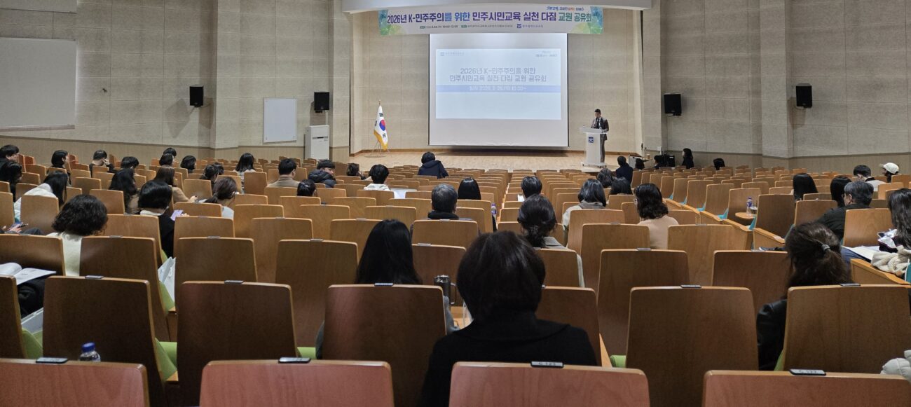 시교육청은 26일 광주시민협치진흥원 대강당에서 초·중·고·특수학교 민주시민교육 담당 교원 200여 명을 대상으로 ‘2026년 K-민주주의를 위한 민주시민교육 실천 다짐 교원 공유회’를 열고 이러한 내용을 안내했다.