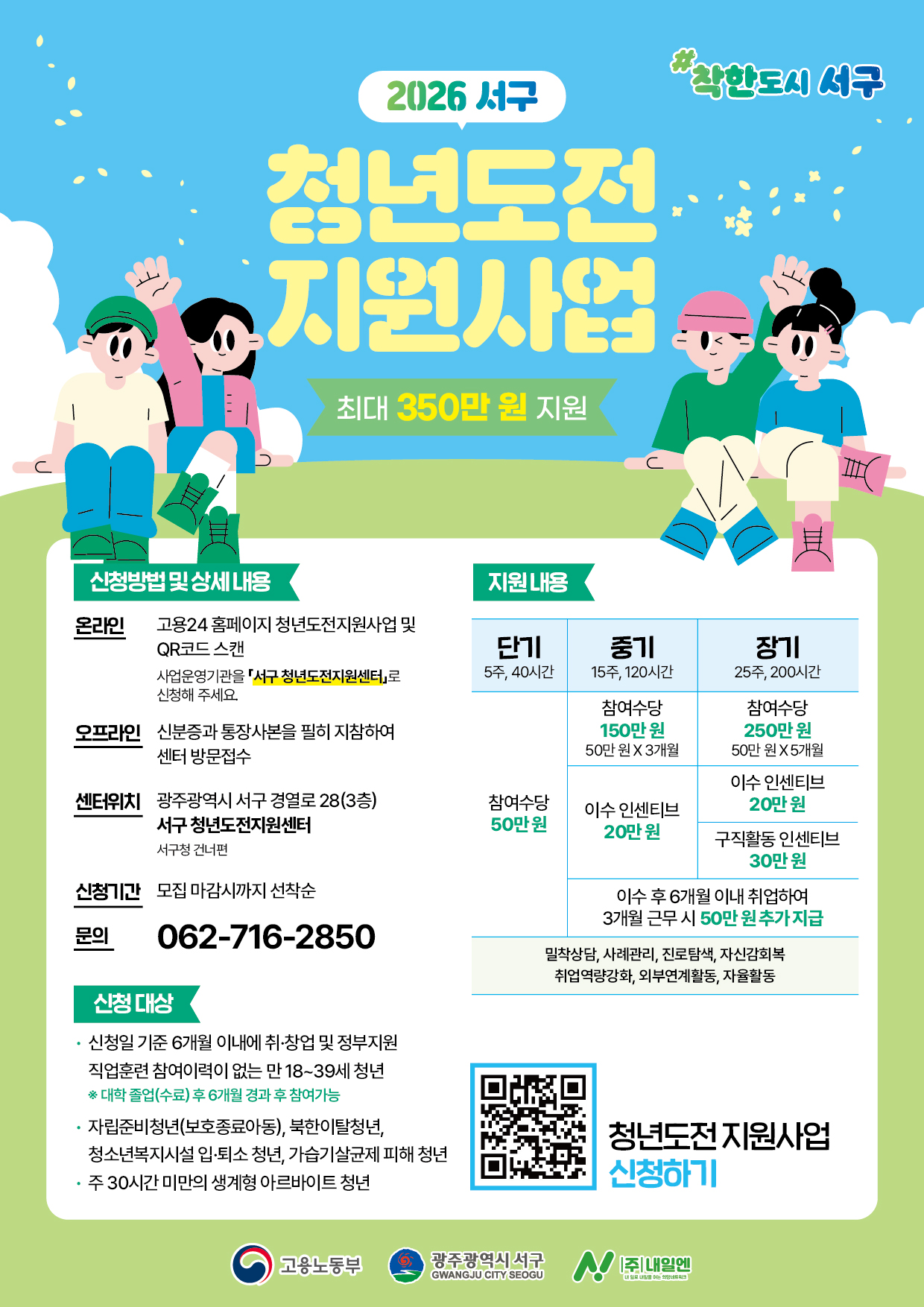 참여 신청은 ‘고용24’ 또는 서구 청년도전지원센터에서 가능하며 자세한 사항은 서구 청년도전지원센터(062-716-2850)로 문의하면 된다.