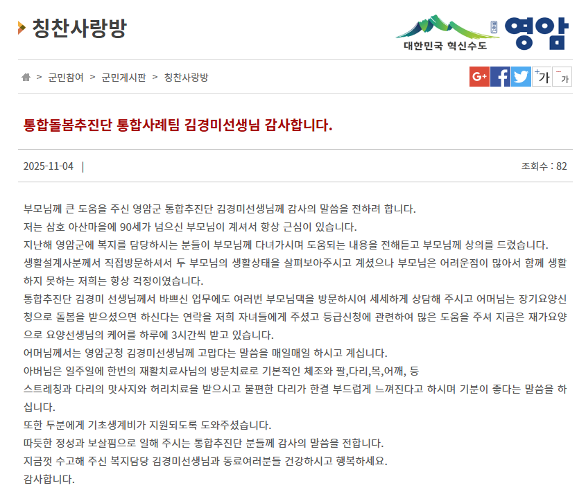 이달 4일 어르신의 딸은 영암군홈페이지 ‘칭찬사랑방’에 글을 올려 영암군의 사례관리와 통합사례관리사의 배려에 고마움을 전했다.