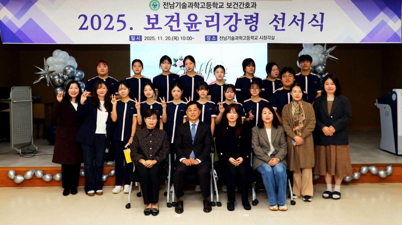 전남기술과학고등학교(교장 홍성희)는 지난 2025년 11월 20일(목) 오전 10시부터 본교 시청각실에서 보건간호과 1학년을 대상으로 ‘2025 보건윤리강령 선서식’을 개최하였다.