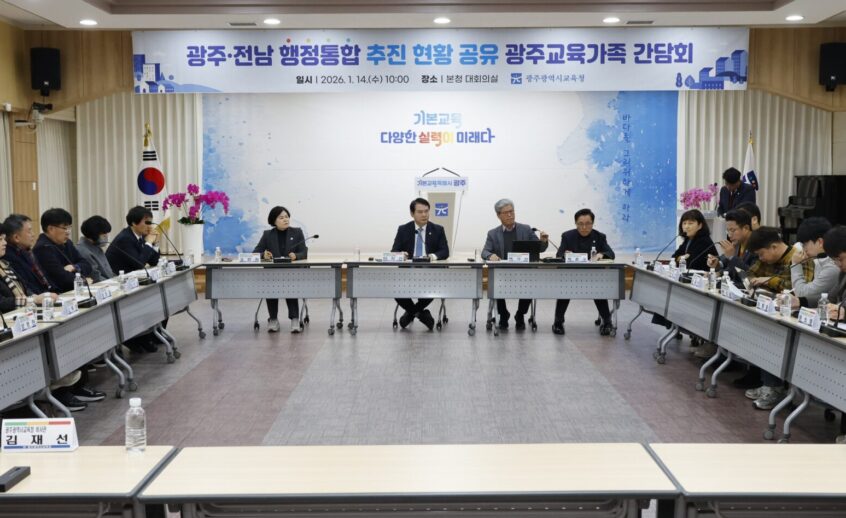 학교·교육단체·노조 초청 간담회 개최…추진 현황 공유 이정선 교육감 “교육 주체 소외 안돼”…관련 의견 청취 광주시교육청(교육감 이정선)이 급물살을 타고 있는 광주·전남 행정통합과 관련해 교육계 의견 청취에 나섰다. 시교육청은 14일 대회의실에서 ‘광주·전남 행정통합 추진 관련 교육가족 간담회’를 개최했다. 이날 간담회는 지난 12일 광주·전남교육감이 발표한 ‘행정통합 공동 선언’의 후속 조치로, 행정통합 추진 과정에서
