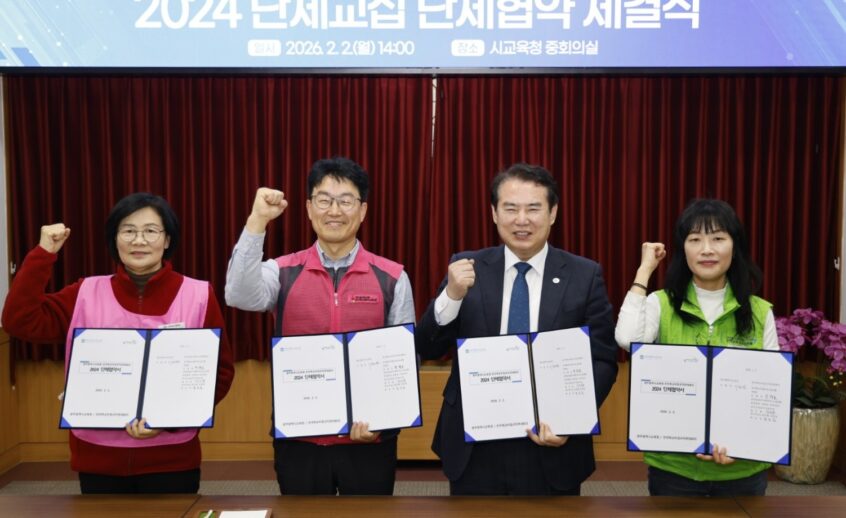 1년 6개월간 교섭…274개 조항 합의 광주시교육청(교육감 이정선)은 2일 본청 중회의실에서 이정선 교육감, 민태호 전국학교비정규직노동조합위원장 등이 참석한 가운데 ‘전국학교비정규직연대회의와의 2024 단체협약’을 체결했다. 협약은 체결일로부터 2028년 8월 1일까지 2년 6개월간 효력을 가진다. 노사 양측은 지난 2024년 4월 요구안 접수를 시작한 이후 본교섭과 68차례 실무교섭을 통해 총 586개의 안건 중 274개 항목에 대해