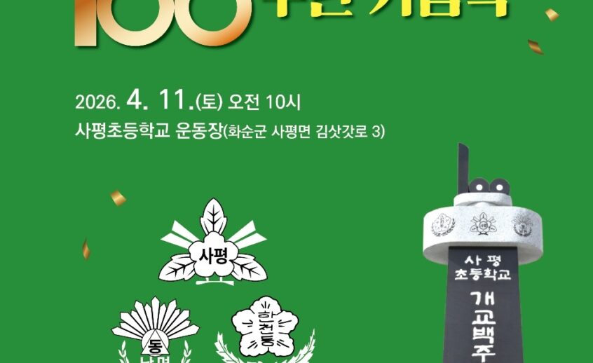 100년의 전통을 넘어 미래로 이어갈 새로운 도약 화순군 사평초등학교 개교 100주년 기념사업추진회(회장 성길모)는 오는 4월 11일 사평초등학교 운동장에서 개교 100주년 기념식을 개최한다고 밝혔다. 이번 기념식은 지난 100년간 지역사회와 함께 성장해 온 학교의 역사와 전통을 돌아보고, 미래 100년을 향한 새로운 도약을 다짐하기 위해 마련됐다. 기념식은 오전 11시 사평초등학교 운동장에서 열리며, 재학생과