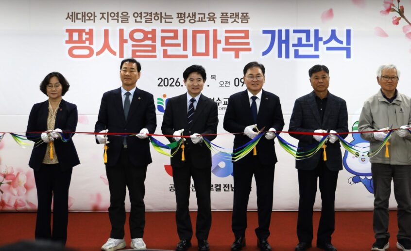세대와 지역을 연결하는 평생교육 플랫폼 구축 전라남도여수교육지원청(교육장 백도현)은 2026년 4월 9일(목) 여수시 돌산읍에 위치한 「평사열린마루」에서 개관식을 개최하고, 지역과 함께하는 새로운 교육·문화 플랫폼의 출발을 알렸다. 이날 개관식에는 김대중 전라남도교육감을 비롯해 여수시청 부시장 및 지역 유관기관 관계자 및 지역 주민 등 약 200여 명이 참석해 개관을 축하했다. 「평사열린마루」는 폐교된 (구)봉덕초등학교평사분교장을 리모델링해 조성된