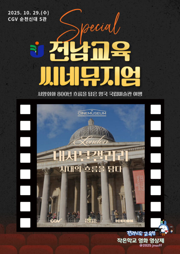 영화관에서 만나는 세계의 미술관 ‘전남교육씨네뮤지엄’ 눈길 2025년 10월 16일 오후 7:50 공유 전남교육청, CJ CGV 협력 인문학 프로그램 순천 ‧ 목포서 운영 전라남도교육청(교육감 김대중)은 오는 29일 CGV순천신대